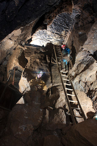 The dig, and thus the extensions, are found by climbing this ladder. At the top of the ladder is a locked gate protecting the new passage. Visits to the new parts of the cave can be arranged by contacting the Orpheus Caving Club |